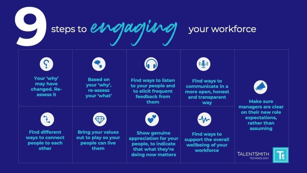 1. Your ‘why’ may have changed. Re-assess it. For instance, let’s say that, in the past, your purpose was recruiting people. Is that still it? Or might your ‘why’ be more orientated towards employee wellbeing and support, or reward and recognition?
